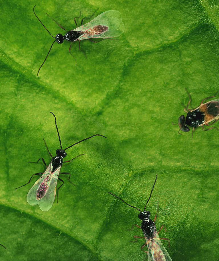 Parasitic wasps are small insects that play a crucial role in natural pest control. They are called "parasitic" because they lay their eggs inside or on harmful pest insects. These parasitic wasp larvae then develop inside the host insect, eventually killing it.