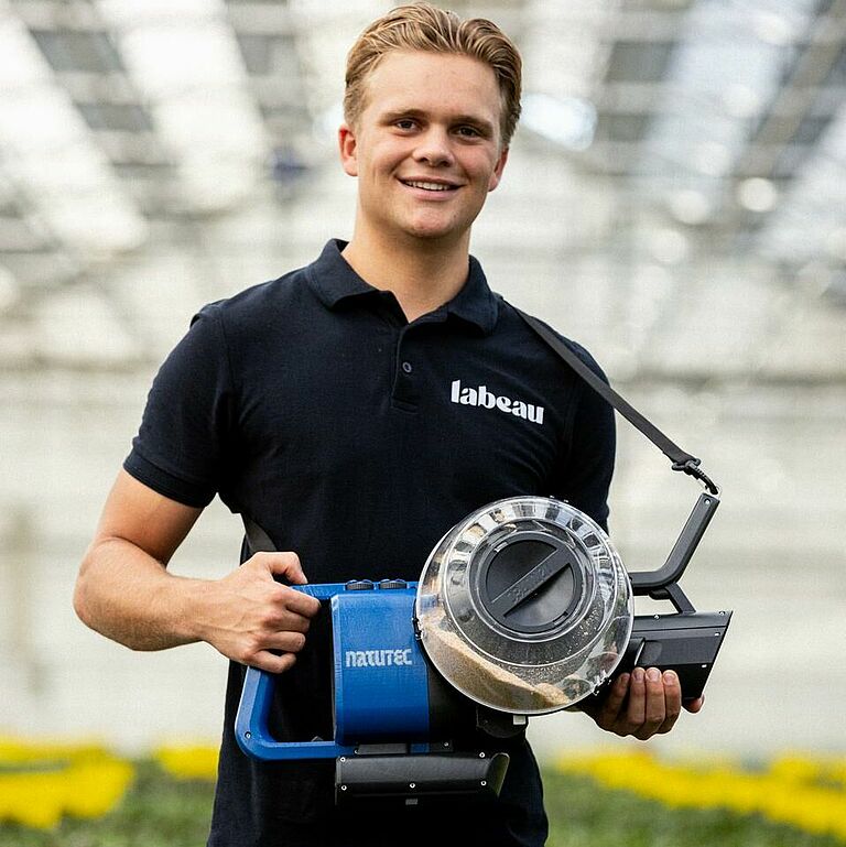 Thanks to its innovative double duct system, the Airobreez disperses natural enemies both from zero to one meter and within a four-meter radius, setting it apart in the market. Koppert consultant Wim van der Meer, who regularly visits Labeau, has also noted the improved reach and effectiveness: "With its gentle airflow, the Airobreez safely disperses natural enemies over crops, and with over 98% reaching their target unharmed, the results are remarkable!"