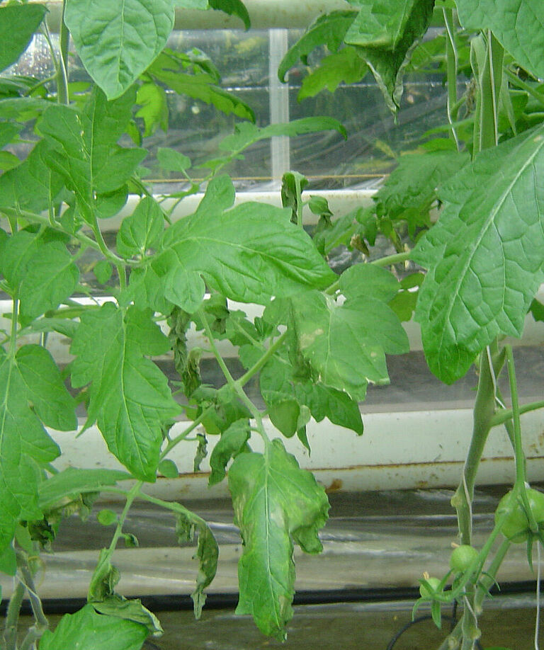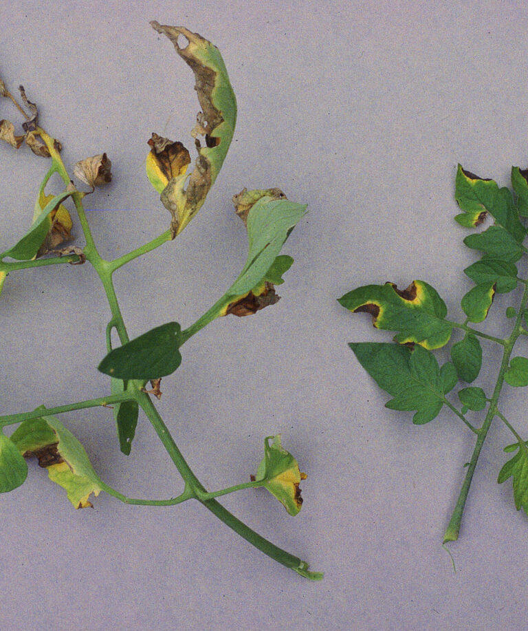 Clavibacter causes spots on stems, leaves and fruits. Leaves and shoots wilt. On the lower leaves, blister-like white lesions occur, which later turn brown and may merge. The leaves wilt and curl upwards, often starting at one side of the plant. They turn brown but don’t fall off. On stems and shoots light stripes form, which then tear, allowing cankers to form. On tomato leaves, water-soaked lesions occur, usually white with a brown centre.