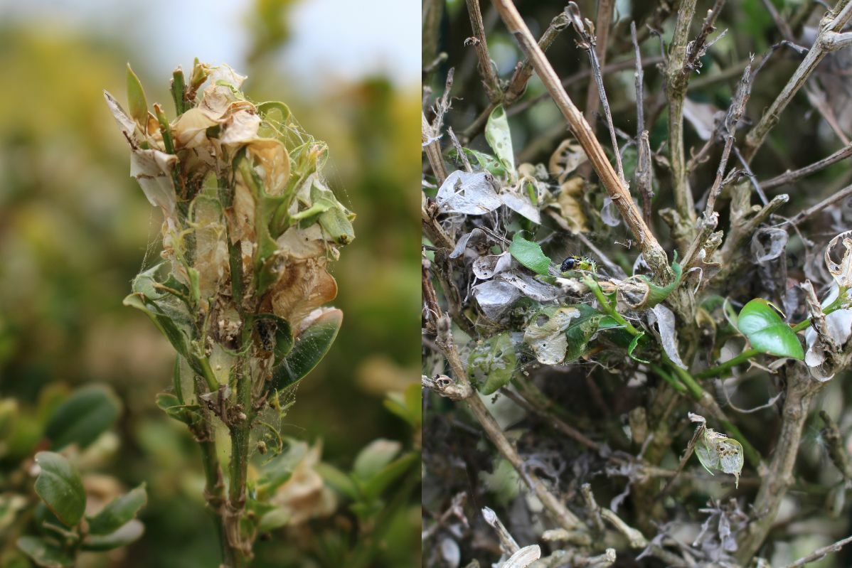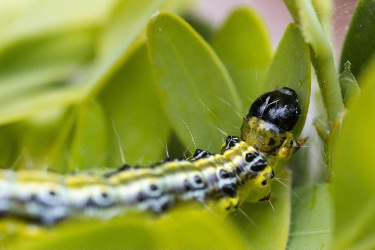 Les chenilles de la pyrale du buis peuvent se développer en grand nombre et, dans les cas les plus graves, tuer la plante. Les chenilles défolient le buis et laissent les feuilles squelettisées et recouvertes de toiles qui peuvent s'étendre sur l'ensemble de l'arbre. Elles peuvent même percer l'écorce des buis plus matures. Les chenilles sont vertes avec des rayures noires et des points blancs caractéristiques.