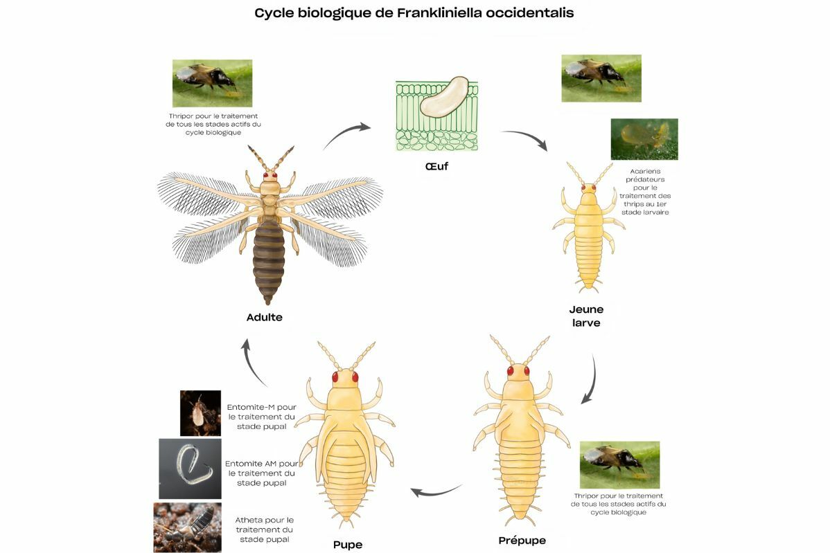 Les thrips déposent leurs œufs dans les tissus des feuilles, des fleurs ou dans les parties tendres de la tige, protégeant ainsi leur progéniture des auxiliaires de culture. Les larves éclosent ensuite et s'installent à la surface de la plante pour se nourrir. Il est alors préférable de faire appel aux acariens prédateurs foliaires comme Amblyseius swirskii (Swirski-Mite), Neoseiulus cucumeris (Thripex), Amblyseius andersoni (Anso-Mite) ou Amblydromalus limonicus (Limonica). Ces espèces se nourrissent principalement du premier stade larvaire du thrips et sont d'excellents protecteurs de culture.