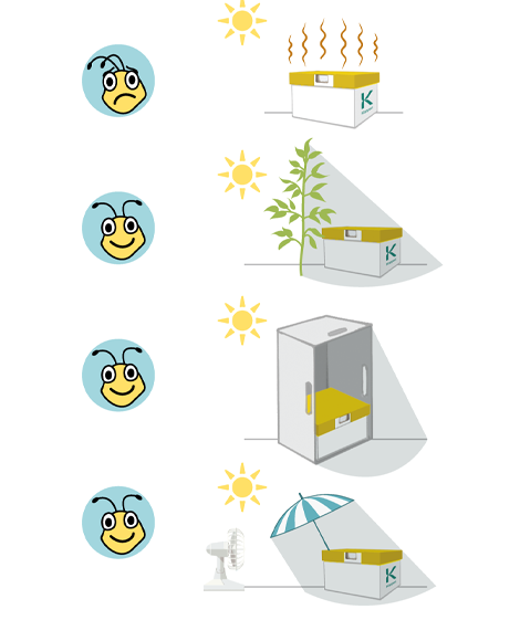 À l'intérieur de la ruche, les bourdons maintiennent la température à un niveau constant. Une exposition prolongée à des températures trop élevées peut provoquer des dommages dans la colonie. Veillez donc à placer la ruche à l'endroit le plus frais de la serre ou au moins à l'ombre, surtout pendant la période la plus chaude de la journée. En hiver, par temps sombre, il peut toutefois être souhaitable de la placer au soleil. Cette ombre peut être fournie par la culture, un cageot ou tout autre écran. En cas de températures extrêmes, des mesures supplémentaires sont nécessaires, comme par exemple un refroidissement actif.