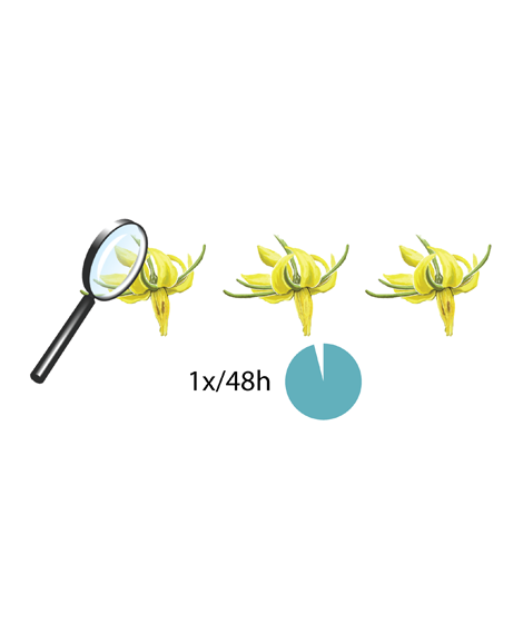 Et cette pollinisation doit être assurée avant que cette fleur ne se ferme. Suivant les conditions météorologiques, une fleur est ouverte pendant un à trois jours. Afin de vérifier que la pollinisation a été effectuée, le mieux est de récolter environ 20 fleurs fermées à différents endroits de la serre. Toutes ces fleurs fermées doivent porter des marques de morsure. Elles permettent de se faire une idée précise de la situation. Les fleurs qui sont ouvertes pendant plus d'un jour portent entre une et cinq marques de morsu.