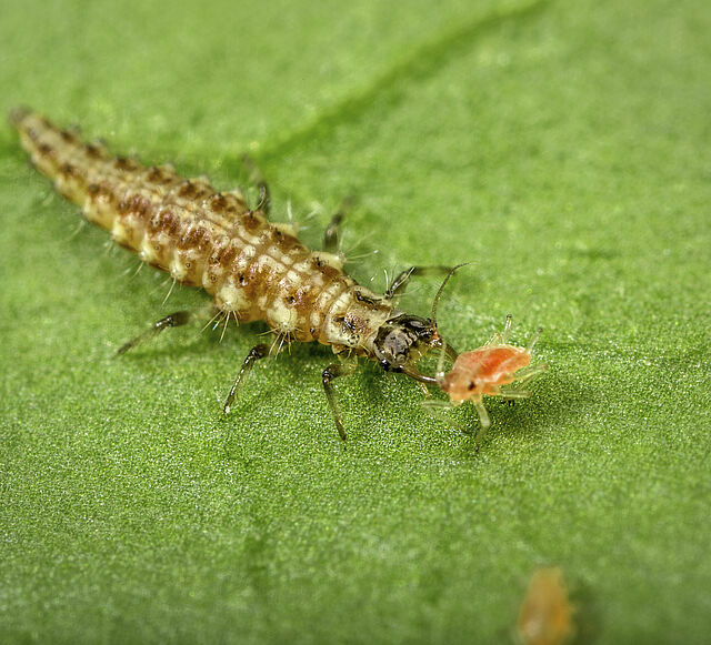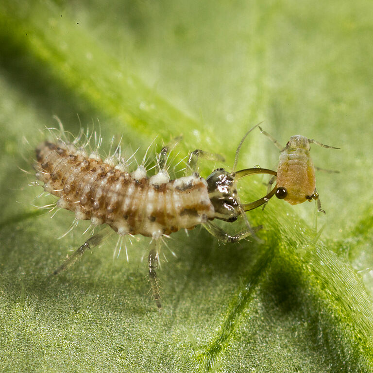 Les larves de chrysope cherchent leurs proies au hasard sur la plante. Leur efficacité est sérieusement entravée par la présence de poils de feuilles. Les larves ne sont pas facilement observables et sont principalement actives la nuit, s'abritant sous la plante ou le bord du pot, pendant la journée. Les larves saisissent leurs proies par le bas et les soulèvent dans leurs mâchoires. La proie est injectée d'un liquide salivaire qui digère le contenu du corps, qui est ensuite aspiré. La proie peut parfois être plus grande que la larve elle-même. En moyenne, une larve consomme 300 à 400 pucerons de différentes tailles au cours de son développement, bien que la quantité réelle dépende de l'espèce de la proie et de la température. Lorsque les proies sont rares, les larves peuvent avoir recours au cannibalisme, les plus âgées mangeant les plus jeunes. Les œufs sont souvent ignorés parce qu'ils se tiennent sur des tiges. Les adultes ne contribuent pas au contrôle biologique. Ils se nourrissent exclusivement de pollen, de nectar et de miellat et la plupart d'entre eux s'envolent hors de la serre.