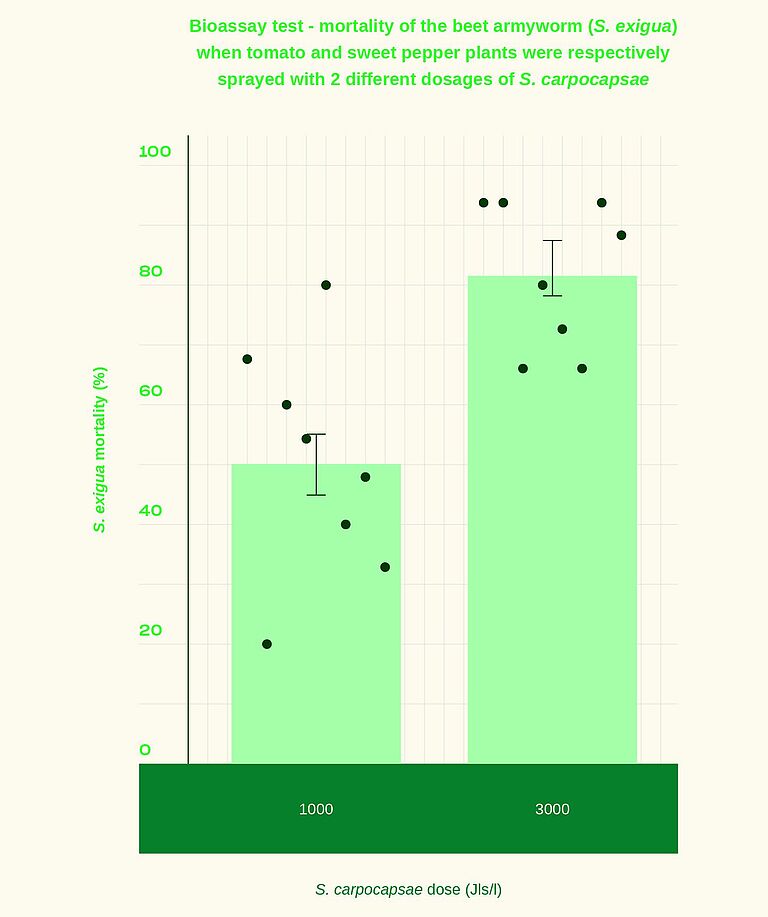 Les départements R&D de plusieurs emplacements Koppert effectuent des recherches depuis des années sur les applications foliaires de nos nématodes. Les expériences en laboratoire et sur le terrain montrent qu'Entonem et Capsanem sont très efficaces contre une grande variété de chenilles. Elles démontrent également que si les nématodes se déplacent le plus efficacement dans une couche liquide, une surface foliaire sèche ne les arrête pas. En fonction des conditions climatiques, les nématodes peuvent survivre sur une surface foliaire pendant plusieurs heures, voire plusieurs jours.
