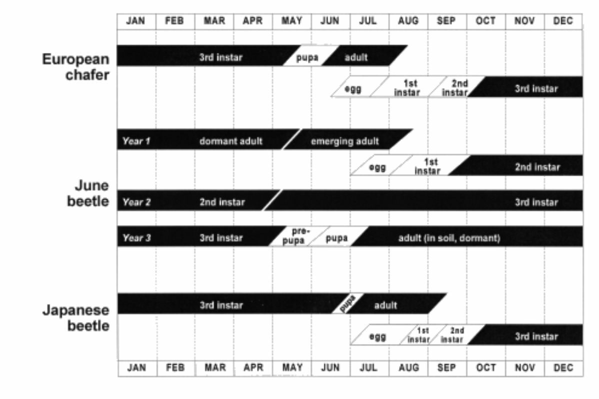 Hint: In early spring, white grubs are often targeted with nematode applications. However, applying during the spring poses a challenge for the nematodes as the white grubs have grown over the winter (3rd instar), making it more difficult for the nematodes to effectively penetrate. By treating later in the season, you target the 1st instar white grub, which proves more manageable for nematode control.