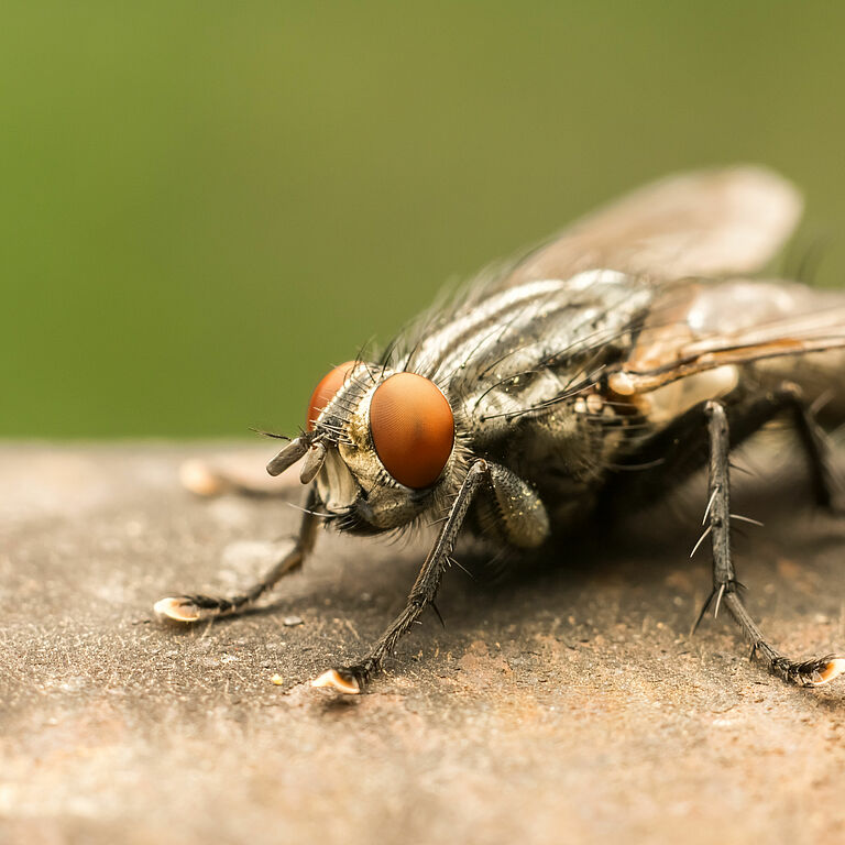 The adult house fly (Musca domestica) is 6–7 mm long, yellowish-grey to dark grey in colour, with four narrow black stripes on the thorax, reddish-brown eyes and clear, translucent wings. Female house flies will typically only mate once and retain the sperm for future egg fertilization. When protein-rich food is available, she will lay up to 500 eggs in several batches on decaying organic matter, such as food waste, carrion or feces, over the course of three to four days.