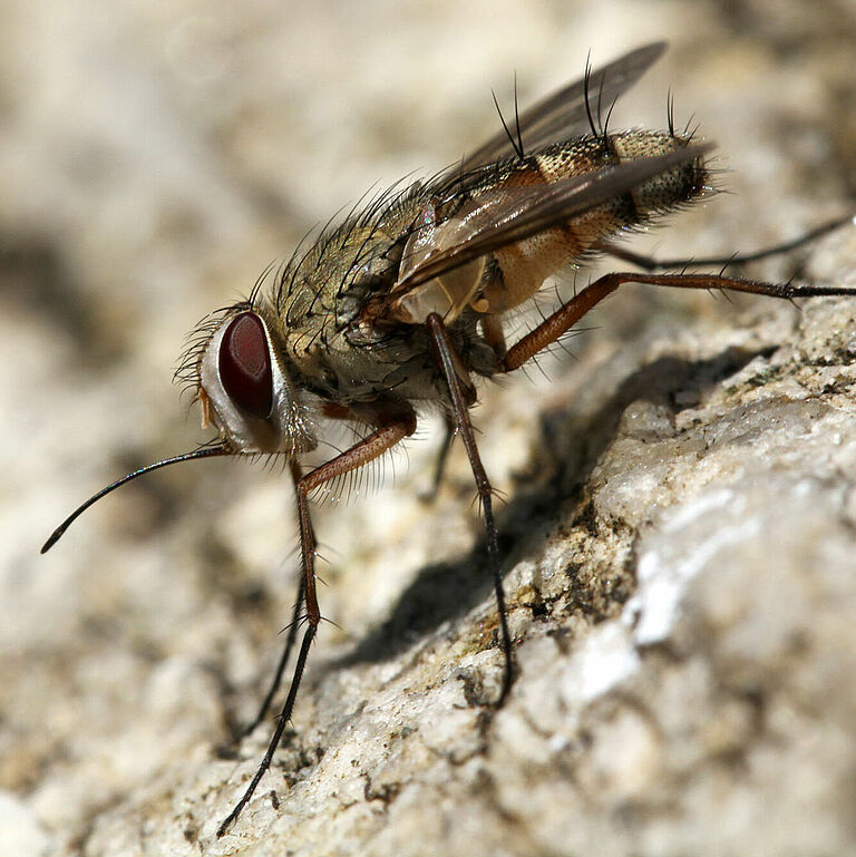 Stable flies belong to the genus Stomoxys, Latin for “sharp mouth”; a fitting moniker, as these flies are the only members of the Muscidae family that feed on mammalian blood (particularly cattle and horses, humans, and pigs to a lesser extent). Although they are extremely common and exist worldwide, it is believed they first originated somewhere in Eurasia. Stable flies superficially resemble house flies, but are lighter in colour and have biting mouth parts. Both male and female flies feed on animal blood, and females must be engorged with blood to lay eggs. They are highly mobile insects and can travel up to 20 km in search of new hosts.